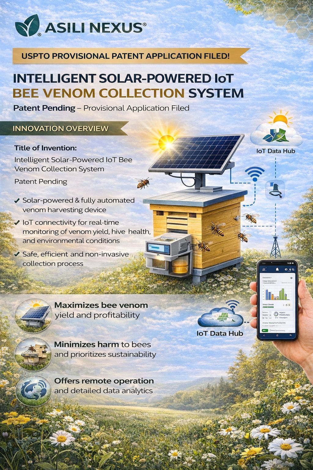 Asili Nexus introduces an advanced, solar-powered and fully automated bee venom collection system, protected under a USPTO provisional patent application, reflecting our commitment to original, defensible innovation. Integrated with IoT technology, the system enables real-time monitoring of venom yield, hive health, and environmental conditions, ensuring precision, efficiency, and transparency in harvesting. Designed to be safe, non-invasive, and bee-first, this patent-pending solution maximizes productivity while minimizing harm to bees—setting a new standard for sustainable, research-grade bee venom collection.